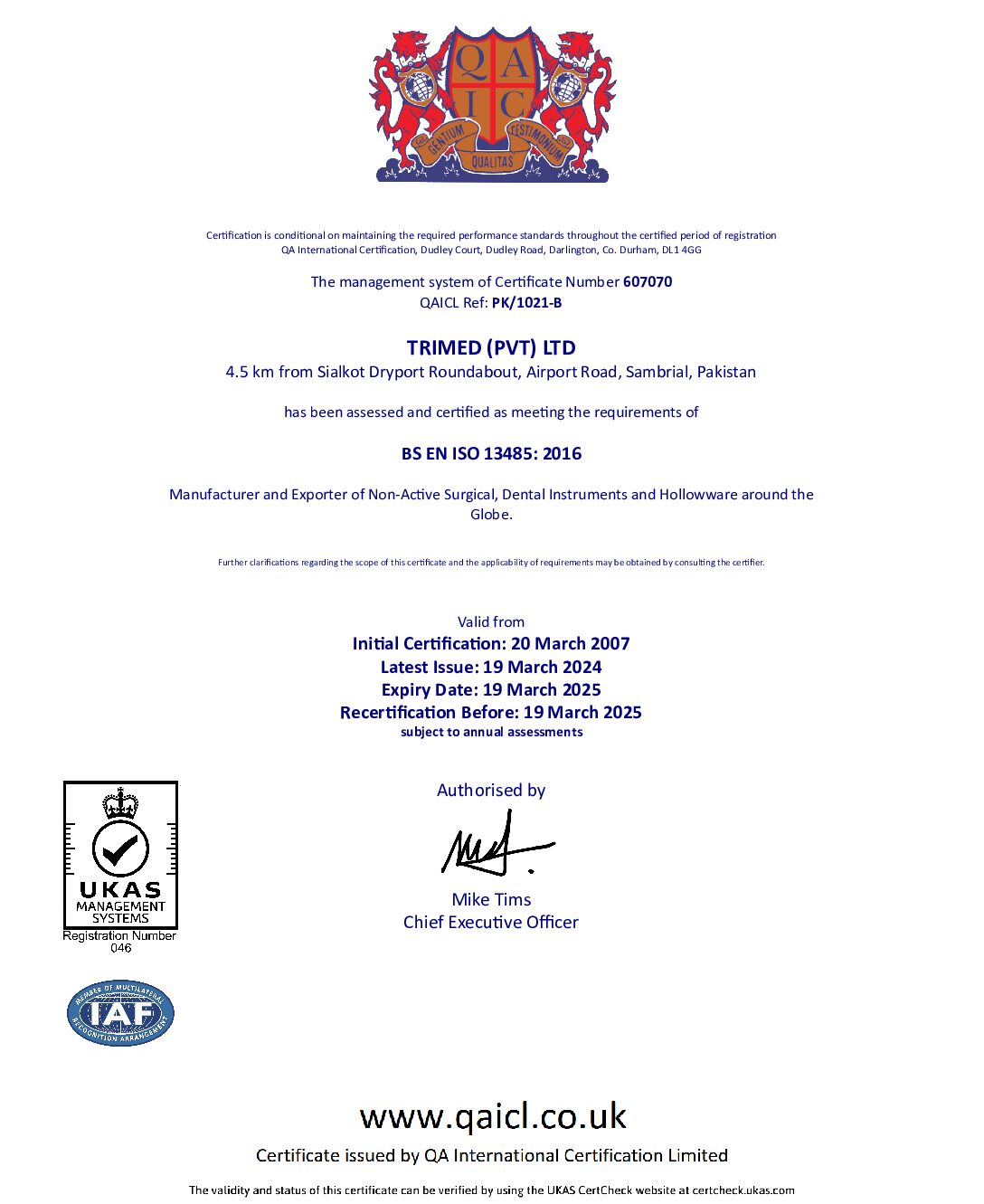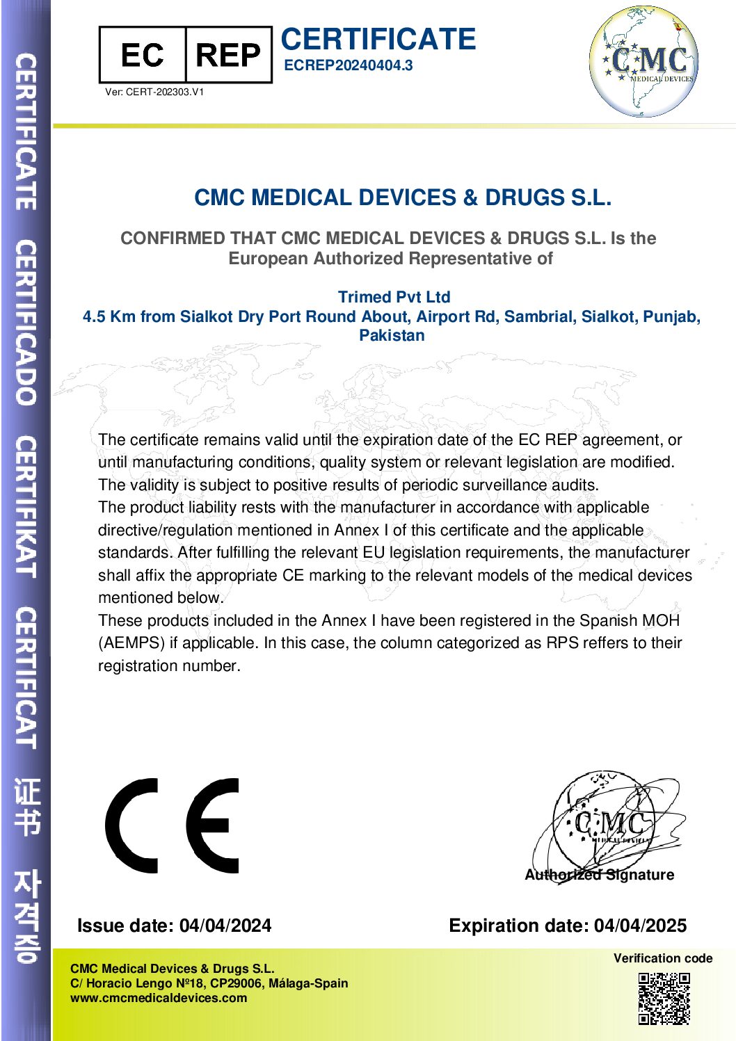 Trimed Pvt Ltd is proud to be MDR-certified in Class 1R Surgical Instruments, ensuring the highest standards of quality, safety, and compliance with European regulations. As Pakistan’s No.1 MDR-certified manufacturer, we are committed to delivering precision-crafted surgical instruments that meet the stringent requirements of global healthcare professionals. Our dedication to excellence, innovation, and regulatory compliance makes us a trusted partner for hospitals, clinics, and distributors worldwide. Whether you are looking for reliable, high-quality surgical instruments or a certified supplier that prioritizes patient safety, Trimed is your go-to source. Partner with us and experience the best in MDR-certified surgical solutions.